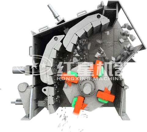 反擊式破碎機(jī)是一種利用沖擊能來(lái)破碎物料的破碎機(jī)械。本機(jī)工作時(shí),在電動(dòng)機(jī)的帶動(dòng)下,轉(zhuǎn)子高速旋轉(zhuǎn),物料進(jìn)入板錘作用區(qū)時(shí),與轉(zhuǎn)子上的板錘撞擊破碎,后又被拋向反擊裝置上再次破碎,然后又從反擊襯板上彈回到板錘作用區(qū)重新破碎,此過(guò)程重復(fù)進(jìn)行,物料由大到小進(jìn)入一、二、三反擊腔重復(fù)進(jìn)行破碎,直到物料被破碎至所需粒度,由出料口排出。調(diào)整反擊架與轉(zhuǎn)子之間的間隙可達(dá)到改變物料出料粒度和物料形狀的目的。